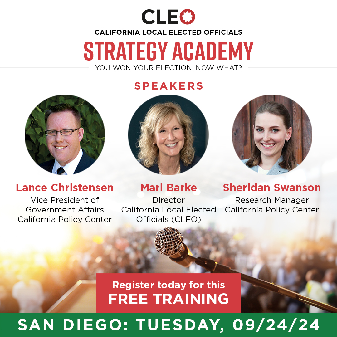 Please join us for CLEO’s Strategy Academy: You Won Your Election, Now What? Effective Strategies for Your First 100 Days in San Diego on Thursday, September 26, 2024 from 6:30-9:30 p.m.